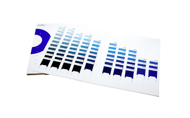 - Mỗi thư mục hiển thị các chip màu vải polyester 5cmX5cm, hai lớp, dán trên giấy bổ sung không huỳnh quang, được sắp xếp theo màu sắc, độ đậm nhạt và sắc độ